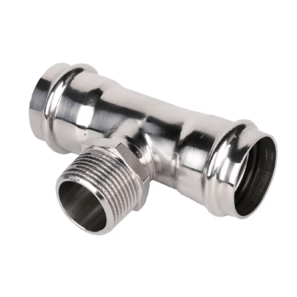 Пресс-тройник из нержавеющей стали с наружной резьбой предназначен для соединения тонкостенных стальных труб с резьбовым элементом системы водоснабжения, отопления, других инженерных и технологических установок. Фитинг рассчитан на эксплуатацию при максимальной рабочей температуре 120 °С. Номинальное давление – 16 бар.