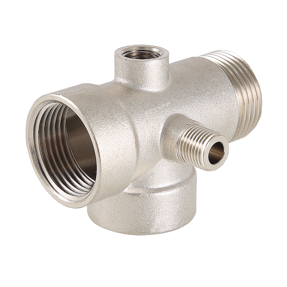 Пятиходовой соединитель для насоса VTr.600 выполнен из латуни CW617N методом горячей объемной штамповки, имеет никелевое гальванопокрытие.