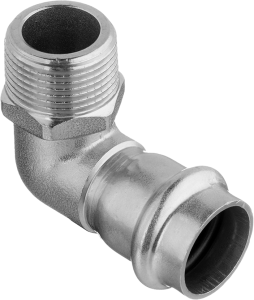Пресс-угольник из нержавеющей стали с наружной резьбой обеспечивает соединение тонкостенной стальной трубы с резьбовым элементом монтируемой системы под углом 90°. Область применения – трубопроводы водоснабжения, отопления, иные инженерные и технологические установки с рабочей температурой до 120 °С и давлением до 16 бар.